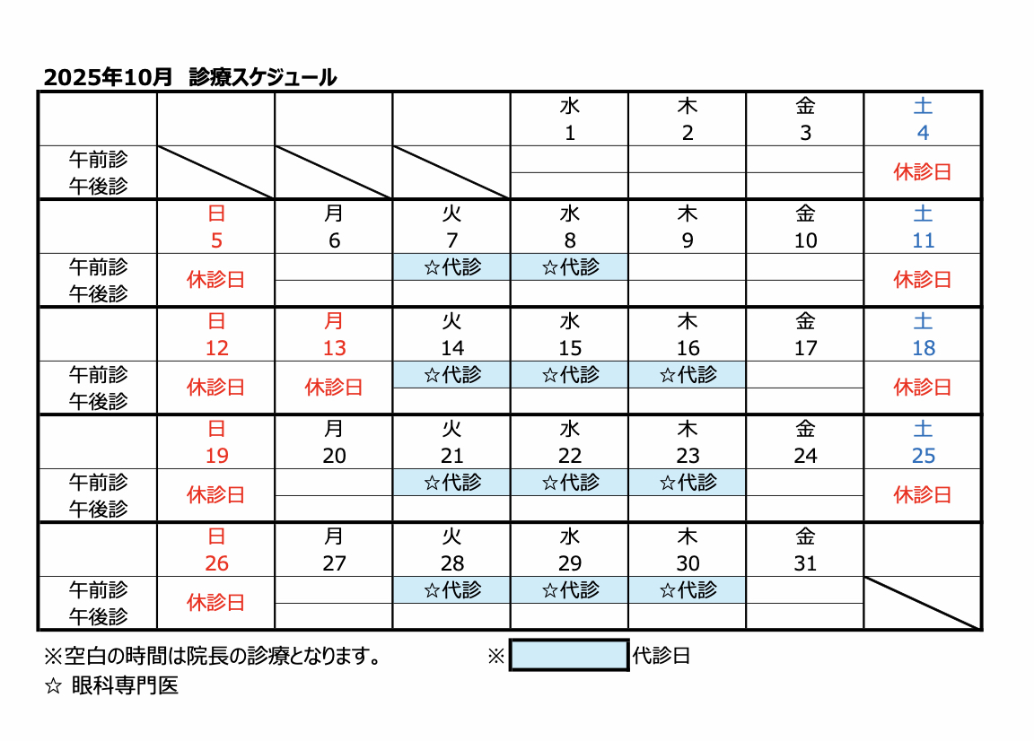2025年10月の診療日程についてお知らせいたします。